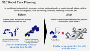 Delivered as part of NEC’s BluStellar initiative, the NEC Robot Task Planning software is equipped with a proprietary algorithm that optimizes the coordinated operation of multiple robots and
